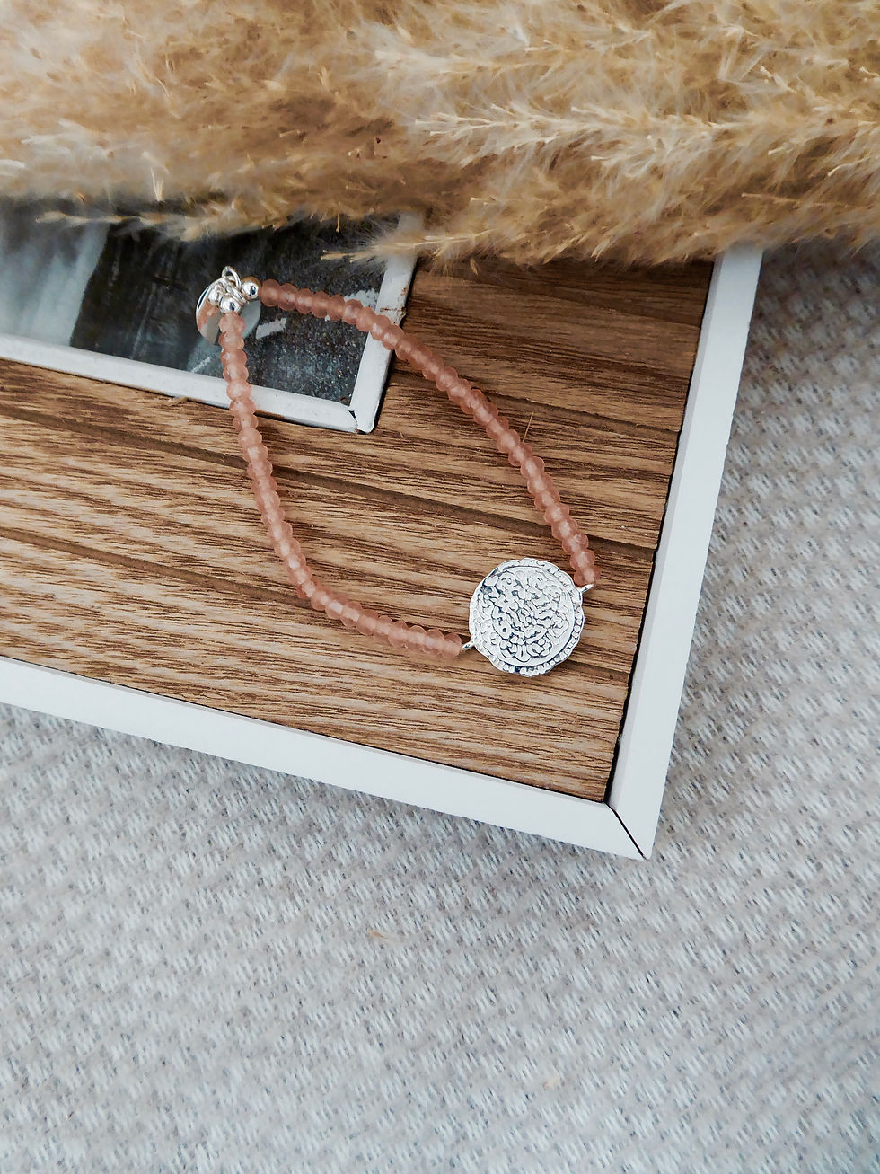 LACHSFARBENES JADE EDELSTEINARMBAND MIT SILBERNEM PLÄTTCHEN